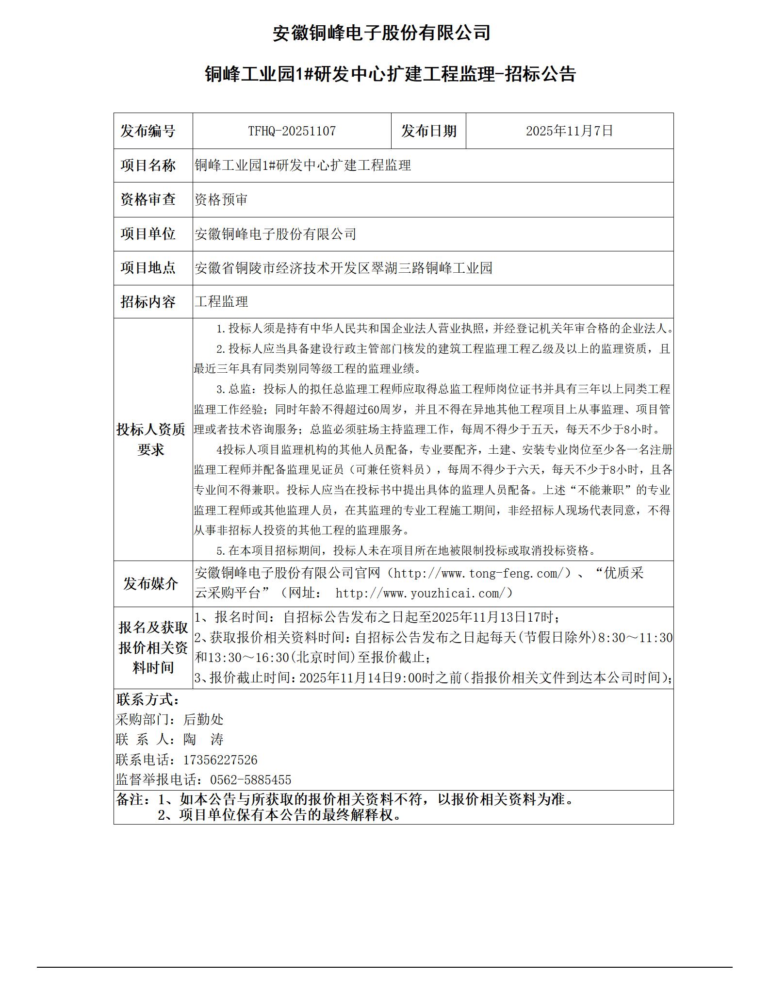 安徽銅峰電子股份有限公司 (銅峰工業(yè)園1#研發(fā)中心擴建工程監(jiān)理 招標公告)_01