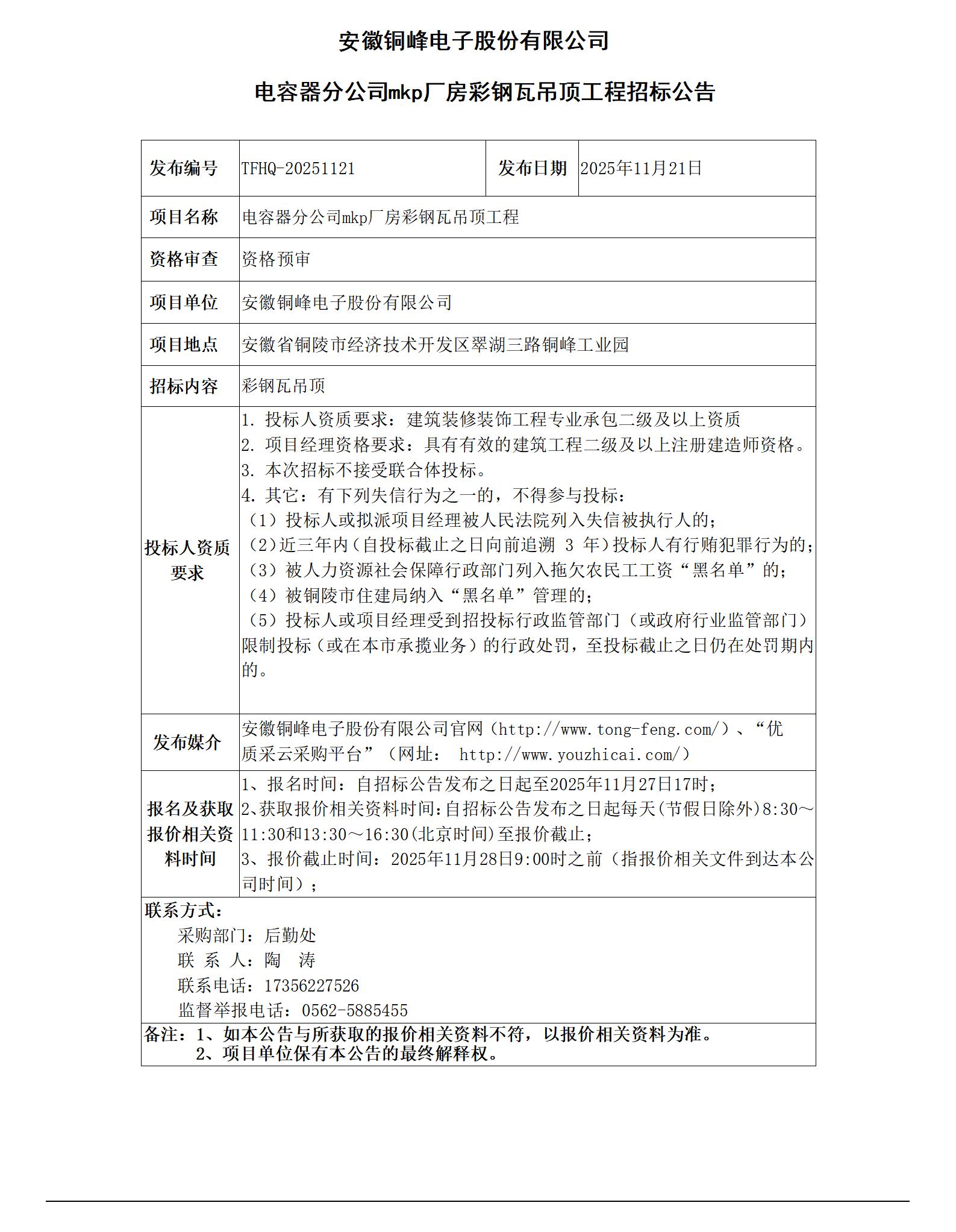 安徽銅峰電子股份有限公司 (電容器分公司mkp廠房彩鋼瓦吊頂工程 招標(biāo)公告)_01