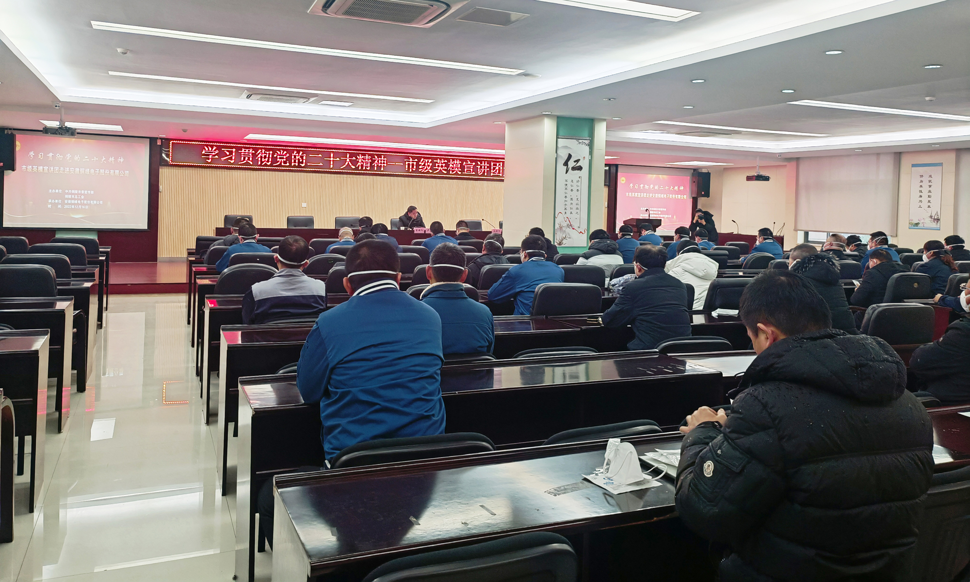 為深入學(xué)習(xí)宣傳貫徹黨的二十大精神,大力弘揚(yáng)勞模精神、勞動(dòng)精神、工匠精神,推動(dòng)黨的創(chuàng)新理論深入人心、落地生根,12月16日下午,由市委宣傳部、市總工會(huì)主辦、公司承辦的“學(xué)習(xí)貫徹黨的二十大精神--市級英模宣講團(tuán)走進(jìn)銅峰電子”宣講報(bào)告會(huì)在公司辦公樓二樓職教室舉行。會(huì)上邀請全國五一勞動(dòng)獎(jiǎng)?wù)芦@得者、銅陵金隆銅業(yè)公司技術(shù)主管盧鵬勞模作黨的二十大精神專題宣講。公司黨委書記、董事長黃明強(qiáng)等公司黨政領(lǐng)導(dǎo)班子成員參加宣講報(bào)告會(huì),公司各黨支部書記、分工會(huì)主席和先進(jìn)模范、新黨員、入黨積極分子、群眾代表等聆聽了報(bào)告。宣講報(bào)告會(huì)由公司黨委副書記潘世宇主持。