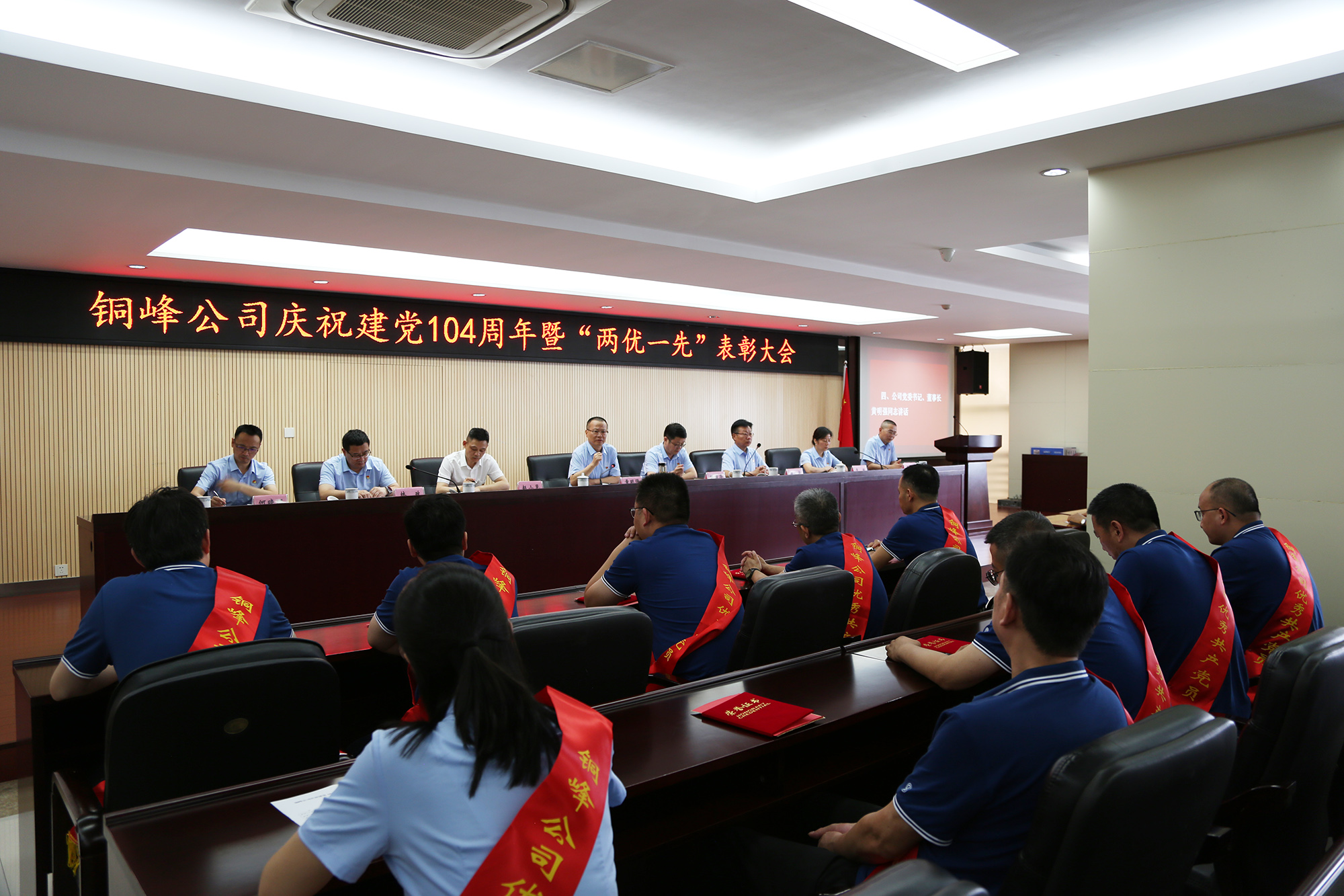 為熱烈慶祝中國(guó)共產(chǎn)黨成立104周年,表彰先進(jìn)、樹(shù)立榜樣,激勵(lì)廣大黨員干部職工在新征程上展現(xiàn)新作為,6月27日下午,公司在辦公大樓二樓職教室隆重召開(kāi)慶祝建黨104周年暨“兩優(yōu)一先”表彰大會(huì)。公司黨委書(shū)記、董事長(zhǎng)黃明強(qiáng)出席大會(huì)并講話(huà),黨委委員、總經(jīng)理鮑俊華宣讀表彰決定,黨委副書(shū)記潘世宇主持會(huì)議并就貫徹落實(shí)會(huì)議精神作出部署。公司黨委領(lǐng)導(dǎo)班子成員和公司級(jí)黨員領(lǐng)導(dǎo),紀(jì)委委員,各黨(總)支部書(shū)記、委員,“兩優(yōu)一先”表彰對(duì)象、黨員代表、新黨員、入黨積極分子代表等參加會(huì)議。
