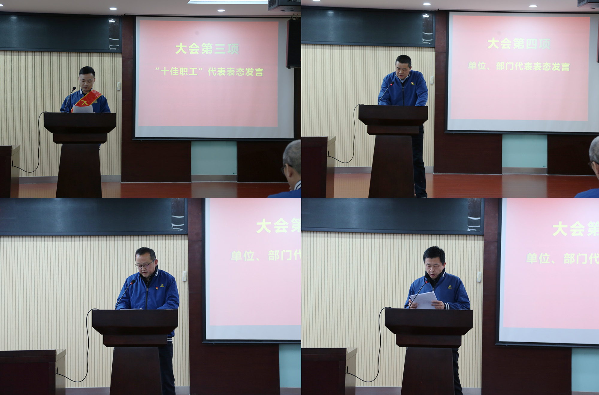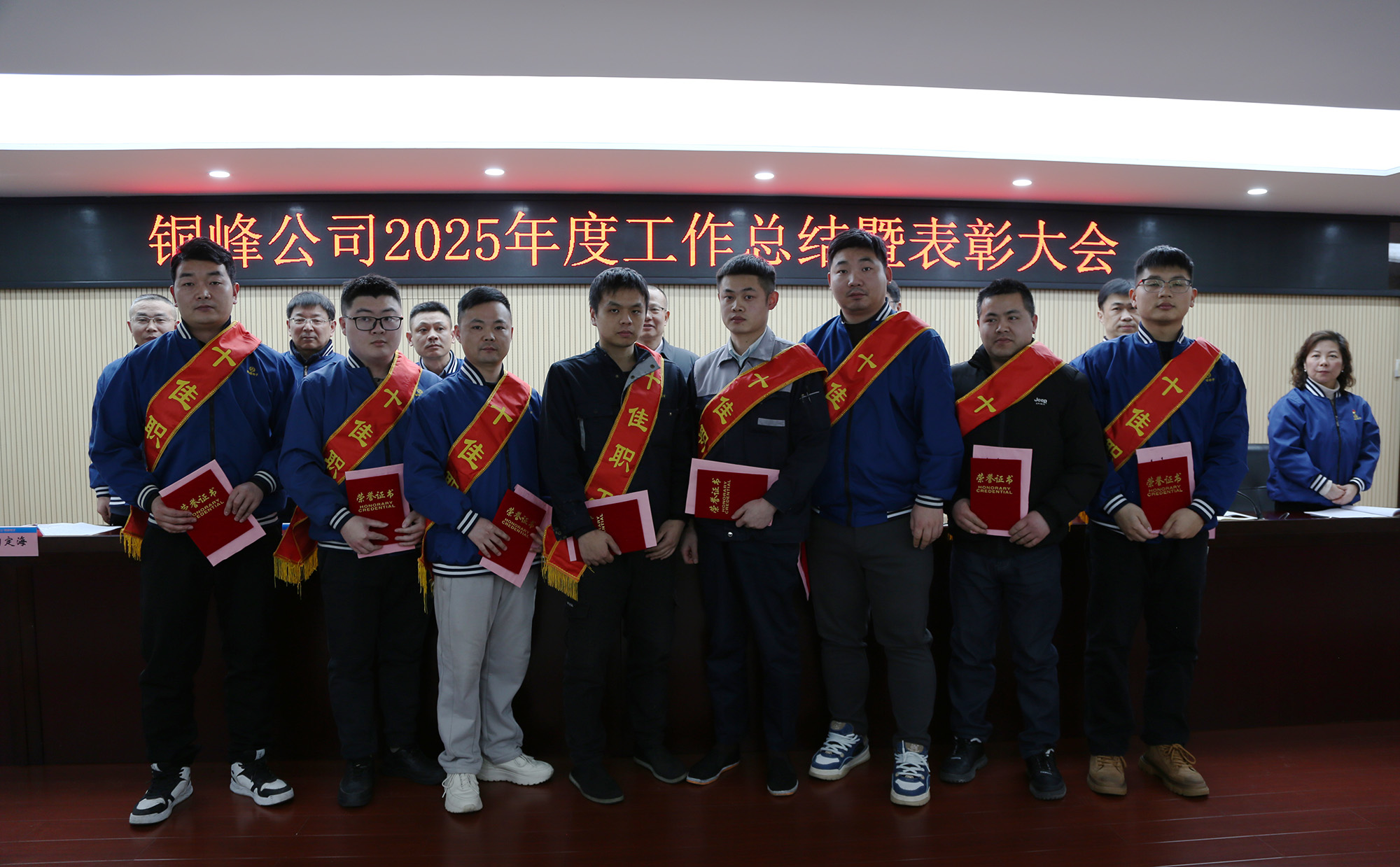 與會(huì)領(lǐng)導(dǎo)為受表彰的2025年度公司“十佳職工”頒發(fā)榮譽(yù)證書(shū)及獎(jiǎng)金?!笆崖毠ぁ?、經(jīng)營(yíng)單位和職能部門(mén)代表分別作表態(tài)發(fā)言。