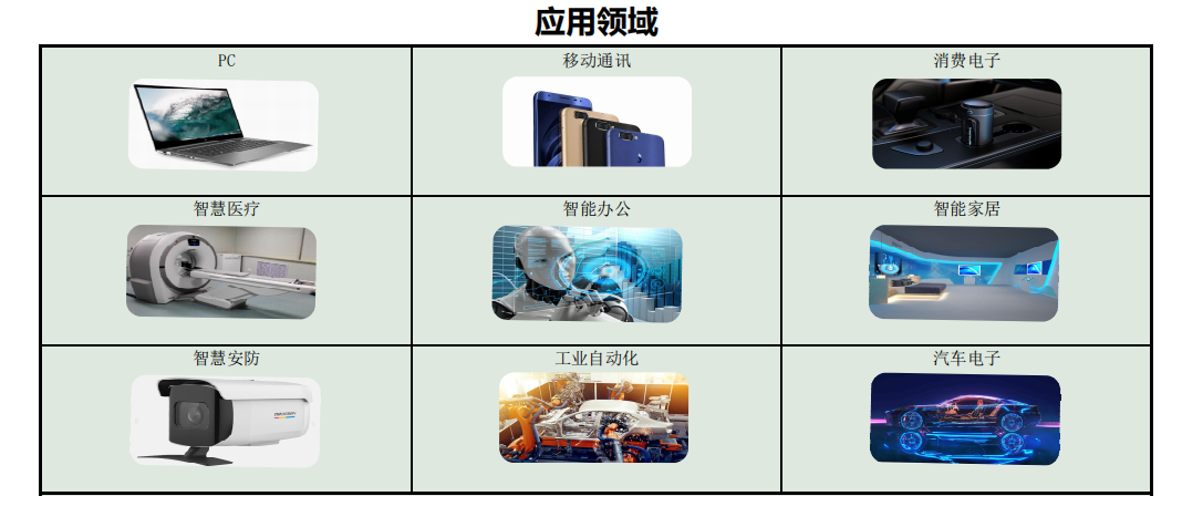 產(chǎn)品廣泛應用于:3C(計算機、通訊、消費電子)、智慧醫(yī)療、智能辦公、智能家居、智慧安防、物聯(lián)網(wǎng)、工業(yè)自動化及汽車電子等領(lǐng)域,靈活滿足全球不同客戶的差異化需求以及快速創(chuàng)新的追求。